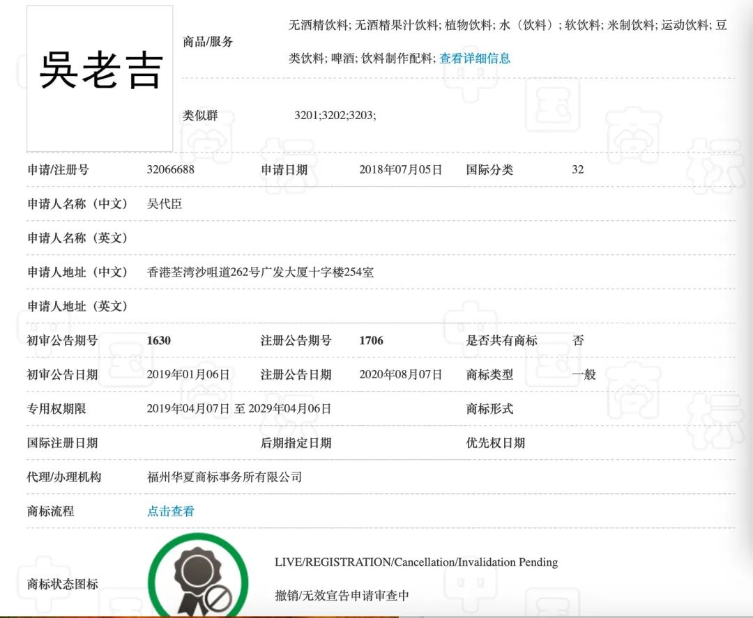 中国商标网公示信息显示,早在2018年7月,一个名叫“吴代臣”的人已在32类商品中申请了“吴老吉”商标。该商标包含了啤酒、茶味非酒精饮料;、无酒精饮料、果汁、植物饮料、水(饮料)、 蒸馏水(饮料)、能量饮料、纯净水(饮料)等,与目前王老吉申请的“姓氏+老吉”饮料的商品范围重合。“吴老吉”商标于2020年8月7日注册公告,专用权期限为2019年4月7日至2029年4月6日。
