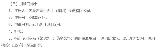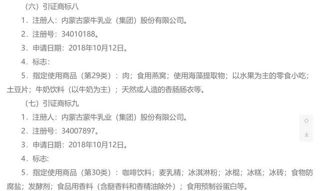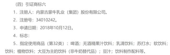 2018年10月12日,内蒙古蒙牛乳业(集团)股份有限公司方面申请第 34010242、34010188、34007897、34005718号商标。