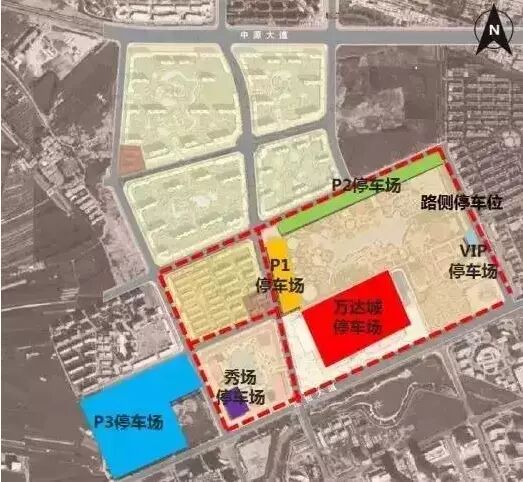 万达城停车场、VIP停车场、P1停车场、P2停车场、P3停车场、秀场停车场、路侧停车位七个停车区,共计14255个停车位。