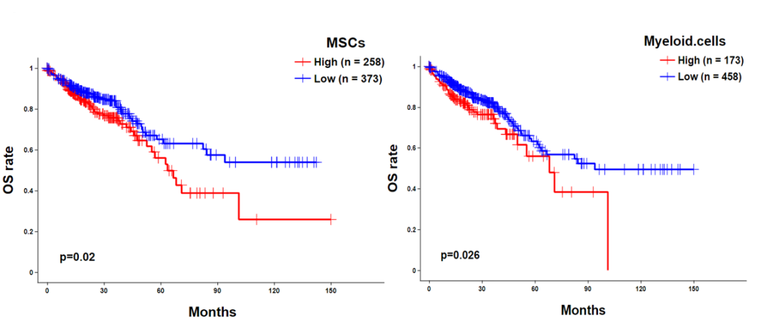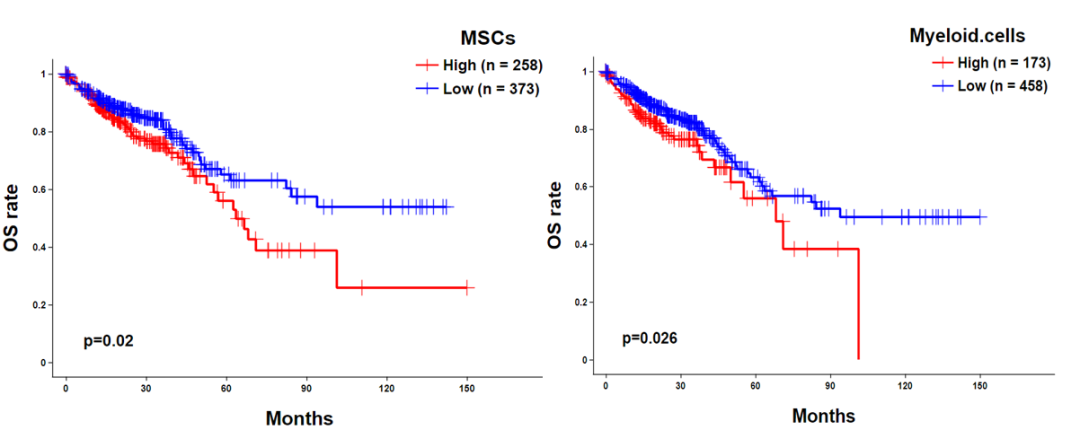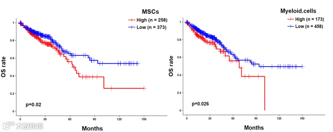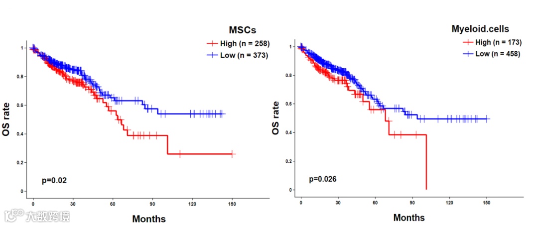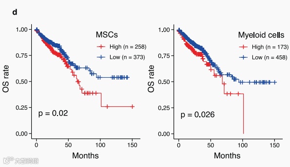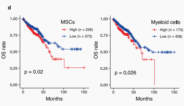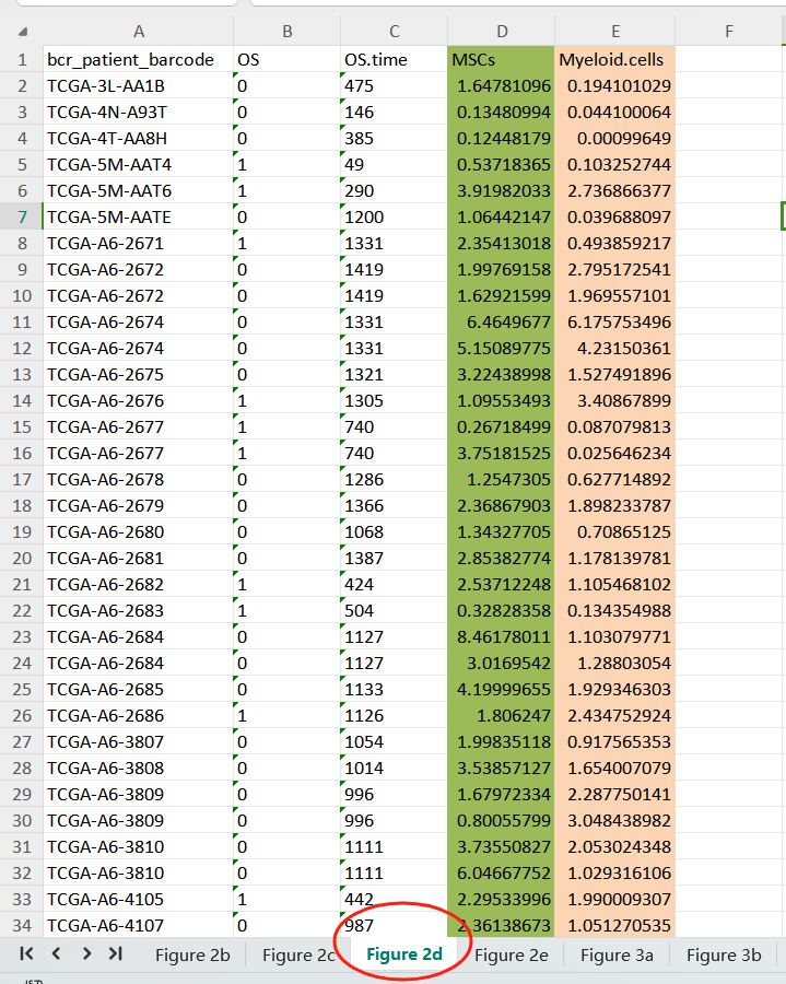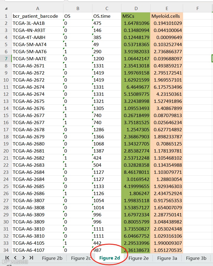 ②用Excel打开Source Data 数据,找到本次复现目标Fig 2d的数据,如下所示。该NC原文通过KM生存曲线探究了来自公TCGA公共数据库的肿瘤患者的MSCs(左)或髓系细胞(右)浸润程度高低是否与较差的OS (d)相关。
