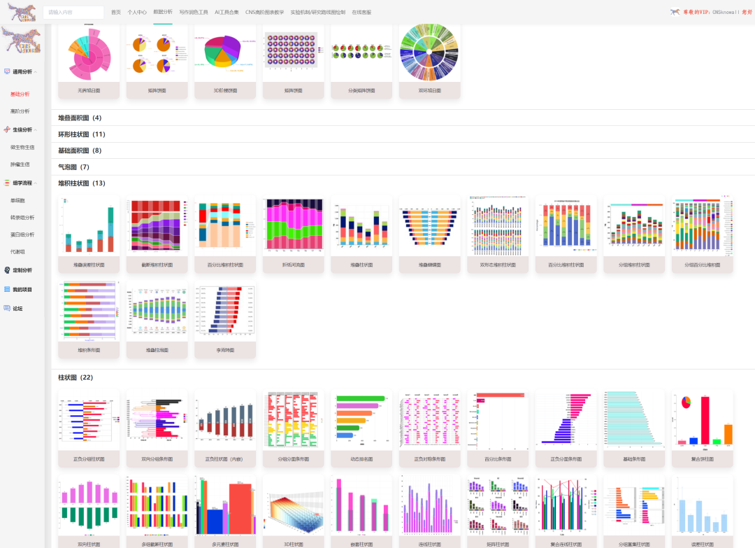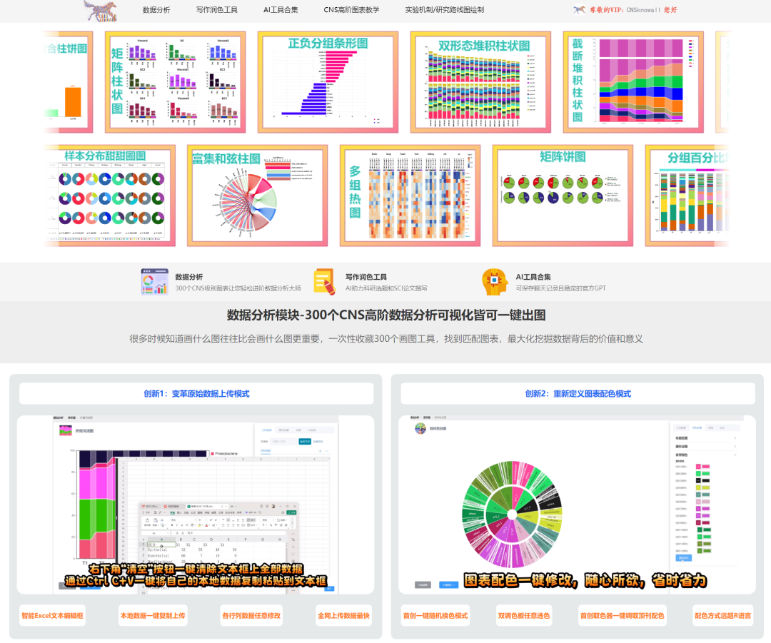 CNSknowall (中文:CNS万事通)平台是今年(24年)1月份新上线的一款专门针对医学领域的现象级的创新型免费在线数据分析云平台,除数据分析外还内置AI文献语聊查询,GPT3.5、GPT学术版、实验机制/研究路线图制作等科研常用功能模块。CNSKnowall平台创立的初衷就是为了解决目前医学生日益增长的高难度数据分析需求与落后的数据分析工具无法达到要求之间的矛盾,和目前常用的数据分析工具如SPSS、Origin、GraphPad Prsim和R语言相比,CNSknowall在数据上传、配色修改和参数调整等各方面做出了一系列颠覆性重大创新,各项性能遥遥领先,几乎没有任何学习成本(包括时间成本和金钱成本)。平台直接提供了>300种数据分析可视化图表以及配套示例数据,彻底改变了传统分析工具需要先下载软件、再去费时费力搜各种图表教程和代码的模式,您只需要简单的套用平台提供的固定数据格式(模板)复制粘贴替换成自己的数据,鼠标点点点就可以完成CNS级别的高水平图表制作,可以让不擅长或没接触过数据分析的人以最短的时间内快速建立医学数据分析的基本思维,以最快的速度掌握各种数据分析技能;让广大受苦受难的医学生用最低的成本,最少的时间,最高的效率快速处理自己的科研数据:从知道自己要画什么图到画出来自己想画的图,让人人不再受数据分析难题的折磨,以最快的速度进阶数据分析大师。可以帮助大家在数据分析上节省大量宝贵的时间,从而可以把时间和精力用在更重要的事情比如查阅文献和设计研究思路方案等,提高文章发表速度和质量,减缓毕业焦虑,赋能职业生涯,开启科研天骄之路!
