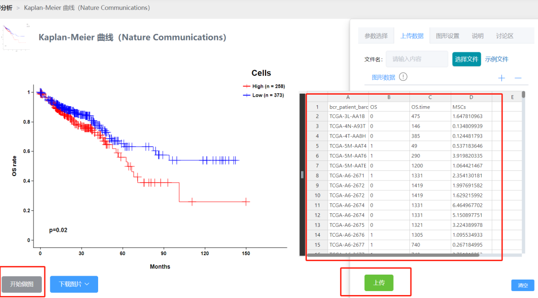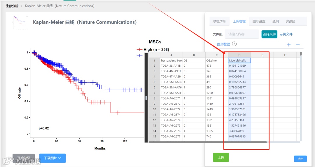 ④将上述②中Kaplan-Meier生存曲线模块右侧文本框表格中的D列MSCs的数据粘贴替换成步骤1②中从原文提供的Myeloid.cells数据,如下所示。替换后依次点击“上传”-“开始作图”选项,即可一秒内画出Fig 2d的右侧KM曲线图。最后将上一步得到的MSCs的KM生存取消图和本步骤得到的Myeloid.cells的生存图拼在一起后即可得到推文开头CNSknowall的复现结果图。