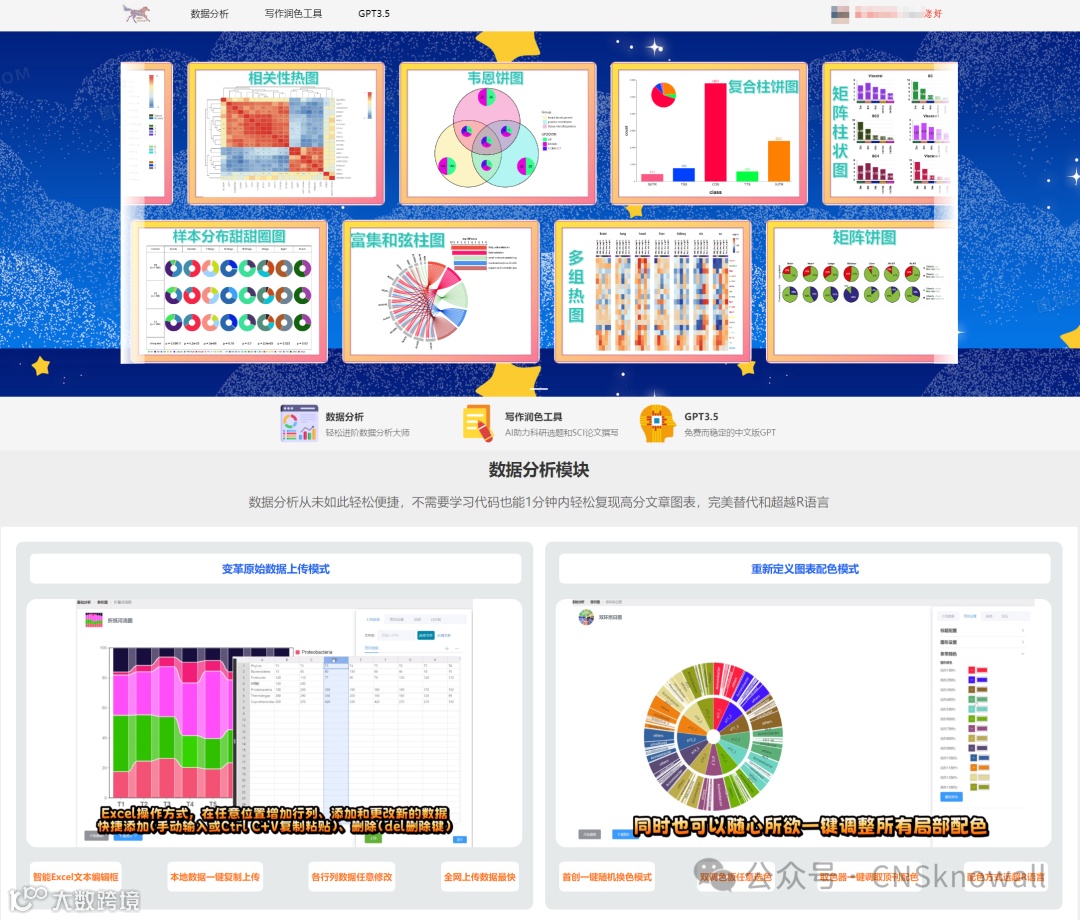 CNSknowall (中文:CNS万事通)平台是今年1月份新上线的一款专门针对医学领域的在线数据分析平台,和目前常用的数据分析工具如SPSS、Origin、GraphPad Prsim和R语言相比,CNSknowall几乎没有任何学习成本(包括时间成本和金钱成本),只需要简单的套用平台提供的固定数据格式复制粘贴替换成自己的数据,鼠标点点点就可以完成CNS级别的高水平图表制作,可以让不擅长或没接触过数据分析的人以最短的时间内快速建立医学数据分析的基本思维,以最快的速度掌握各种数据分析技能,帮助大家在数据分析上节省大量宝贵的时间,从而可以把时间和精力用在更重要的事情比如查阅文献和设计研究思路方案等,提高文章发表速度,减缓毕业焦虑,赋能职业生涯,开启科研天骄之路!