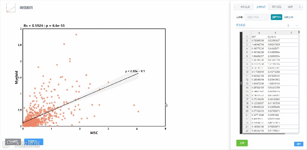 上传文件需要按照示例文件的格式进行整理,示例数据格式要求包含两列数据,分别为自变量数据及因变量数据,首行为自变量名称和因变量名称。