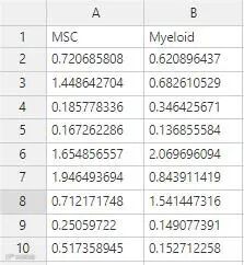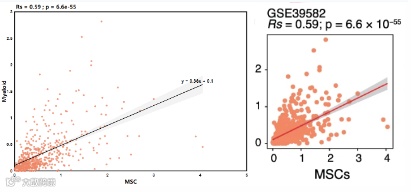 该文通过线性回归图展示了间充质干细胞(MSCs)与髓系细胞(Myeloid cells)之间的相关性强度。同时展示了线性回归的最佳拟合线和Spearman相关性的值,以此来揭示两种细胞之间的相关性。图上方的相关性系数(Rs)和p值提供了关系的强度和统计显著性的信息,图中的误差带表明了95%置信区间,提供了相关性估计的精确度。