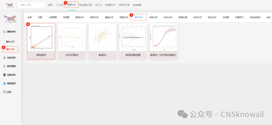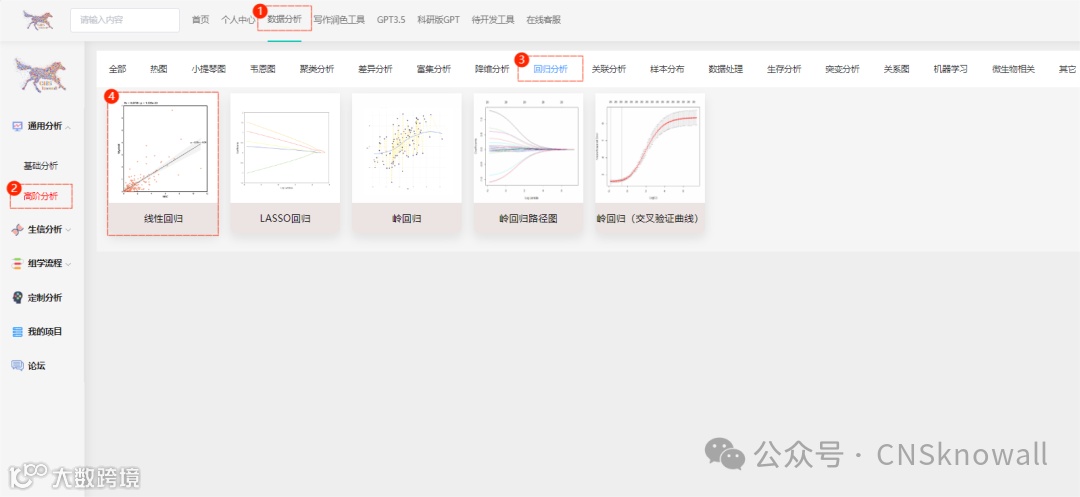 登录后进入:数据分析➡通用分析➡高阶分析➡回归分析