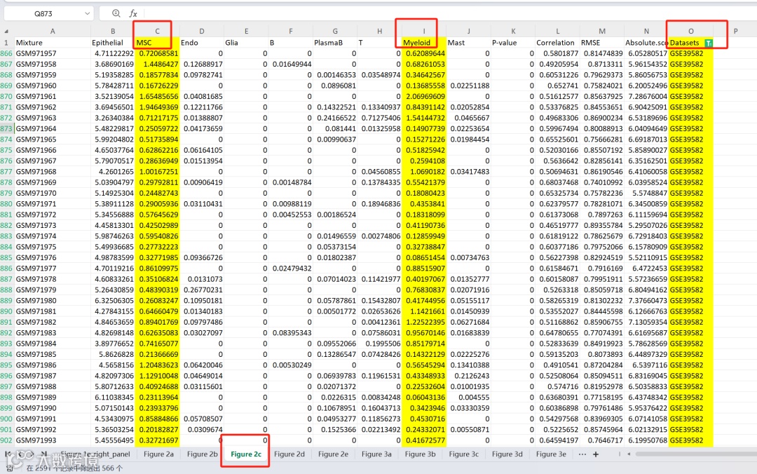 该文章首先对收集的5例非转移性结直肠癌(CRC)临床样本进行单细胞测序,鉴定到了CRC肿瘤微环境中的9种主要细胞群。由于临床样本数量太少导致后续分析受限,作者继续纳入了14个公共数据库来源的CRC患者队列(共包含2550个样本)进行分析。为了确定CRC微环境中的9种主要细胞群之间的关系,作者分析了这9种主要细胞类型在14个CRC队列中浸润模式的成对Spearman相关性(对每个队列中的9种细胞都进行两两配对,每对细胞逐个进行Spearman相关性分析)。通过该分析发现间充质干细胞(MSCs)与髓系细胞(Myeloid cells)的浸润水平在14个CRC队列中均呈现出明显的正相关关系,因此该文章将9种主要细胞中的MSCs和Myeloid cells的Spearman相关性分析结果进行了可视化展示(Fig 2c)。