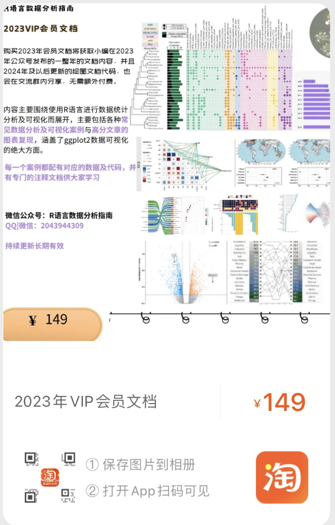 ❝本节介绍到此结束,有需要学习数据可视化的朋友,欢迎到小编的「淘宝店铺」 「R语言数据分析指南」下单购买,内容主要包括各种「高分论文的图表分析复现以及一些个性化图表的绘制」均包含数据+代码。