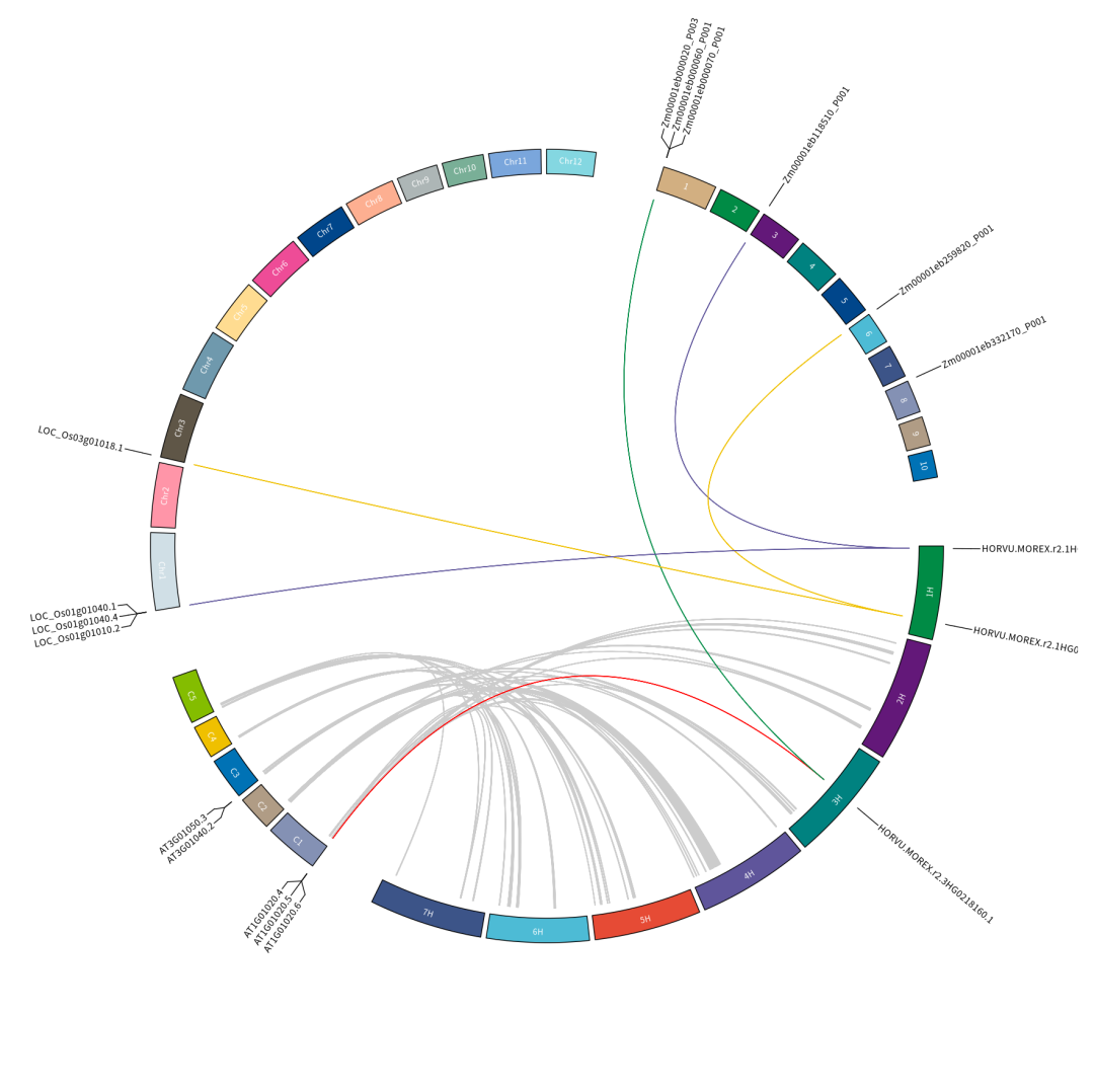 ❝此图主要展示了大麦,拟南芥,水稻,玉米四个物种之间的共线性分析结果,由于四个物种间共线性数据太多,因此只筛选了部分数据进行展示,彩色线条为随时绘制不代表实际数据。通过此图可以清楚的同时展示4个物种的共线性分析,使得结果展示更加的丰富。