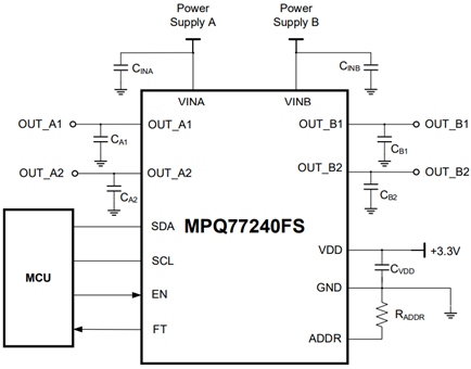 MPQ77240带锁相环 (PLL) 的恒定导通时间 (COT) 控制可提供快速瞬态响应。在连续导通模式 (CCM) 下,2.2MHz 的固定开关频率 (fSW) 可大幅降低对外部电感和电容的要求。此外,它提供数字接口以提高应用灵活性,输出电压 (VOUT) 、上电顺序和保护阈值均可通过该接口进行调整,同时也提供故障状态监控与完善的保护功能。