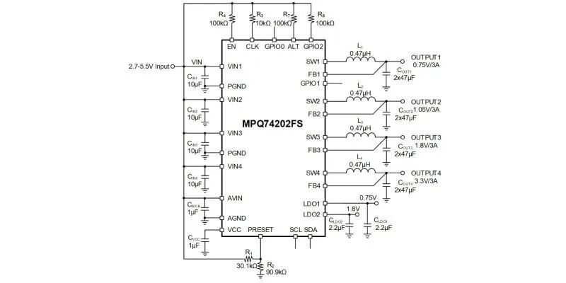 MPQ7420X每通道提供高达 3A 的连续输出电流 (IOUT),在宽输入电压 (VIN) 电源范围内具有出色的负载和线性调整率。它的四个降压变换器可并联工作,以提供 6A 或 12A 的 IOUT。此外,buck 1 还支持外部 DrMOS 操作,以提供高达 50A 的 IOUT。