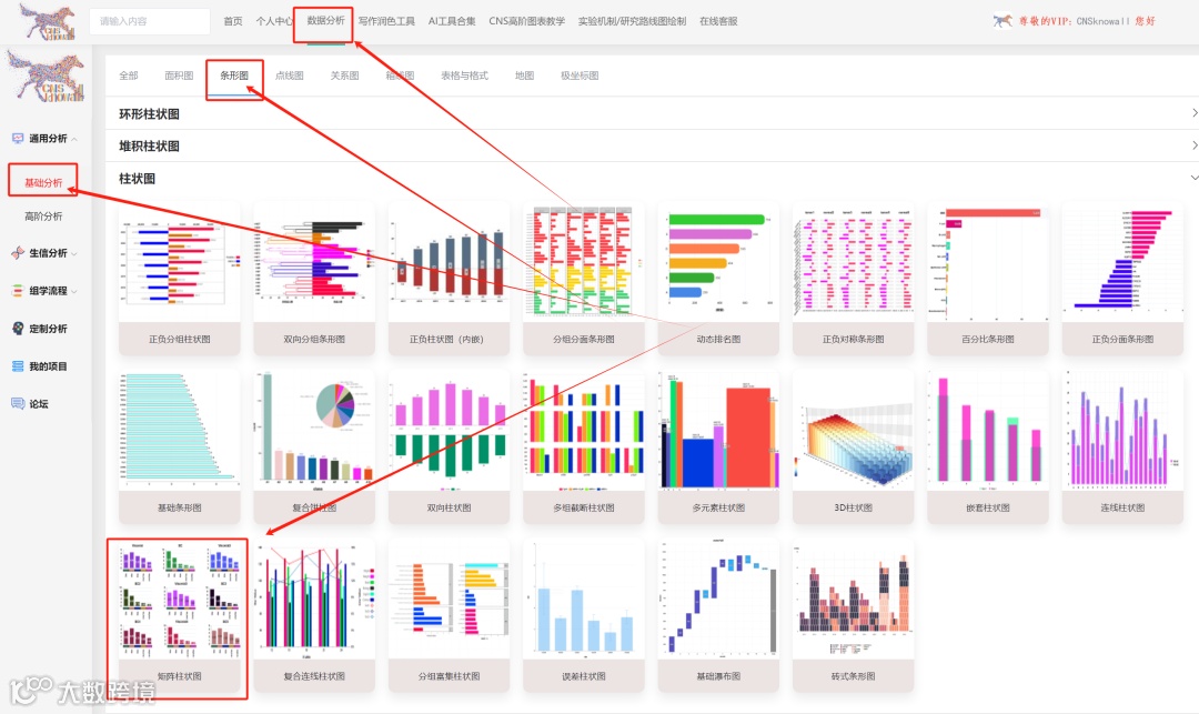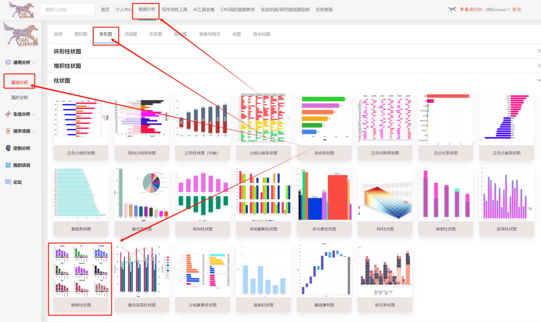 直接微信扫码登录即可免费使用,进入“数据分析”——“基础分析”——“柱状图”,点击进入矩阵柱状图分析界面。