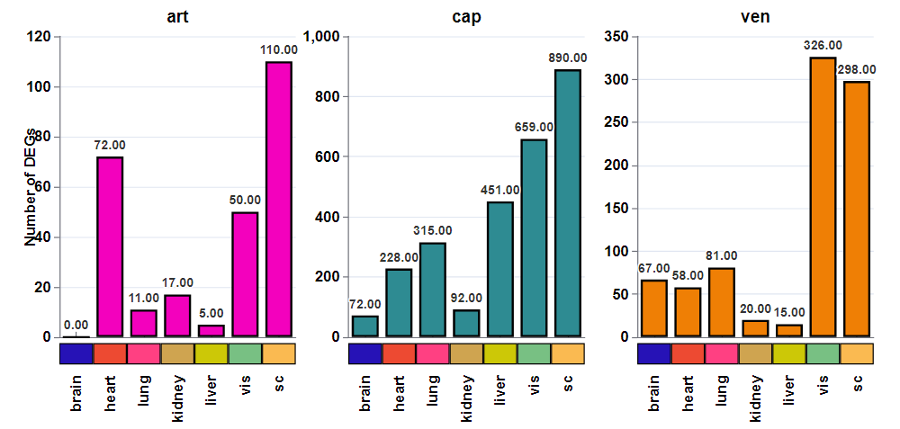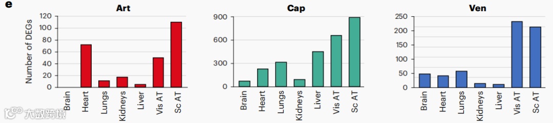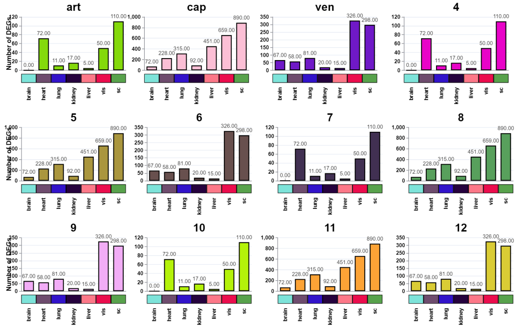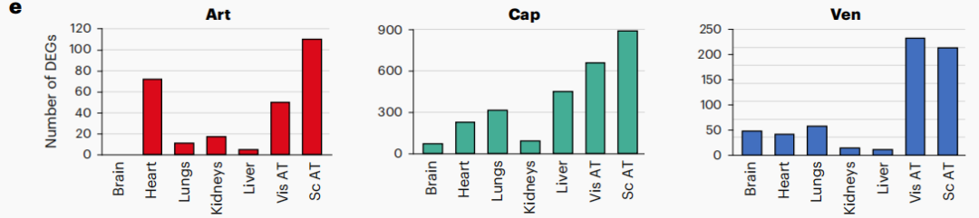 在本次复现的目标文献中,作者对进行正常饮食(chow diet)和西方饮食(WD diet)小鼠的脑、心脏、肺、肾脏、肝脏、内脏脂肪组织(Vis AT)和皮下脂肪组织(Sc AT)共7个主要器官中分离出的内皮细胞【分为三类,包括动脉和小动脉(art,a),毛细血管(cap,c)和小静脉(ven,v)】进行scRNA-seq测序,用多组批量矩阵柱状图展示了7种器官(横坐标)中的三种内皮细胞(3个分组=3个柱状图)各自的差异基因数量(Number of DEGs,纵坐标)。