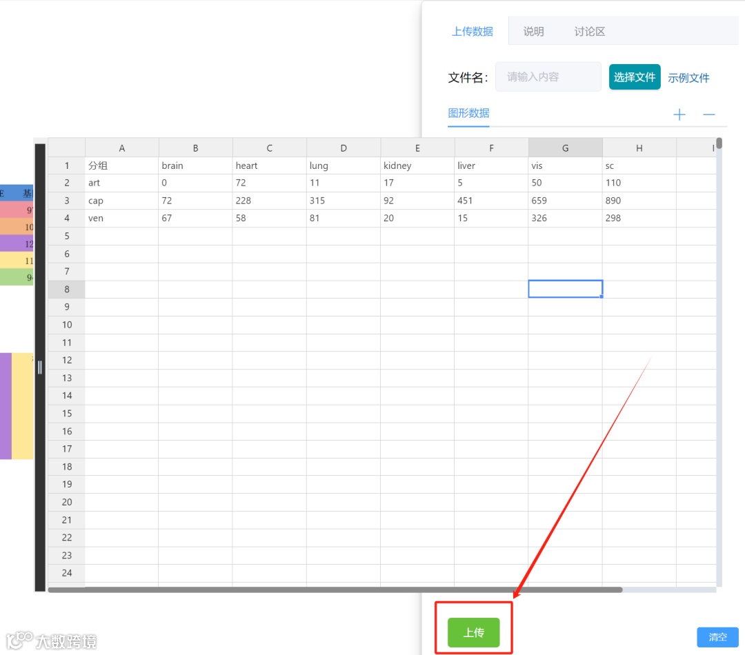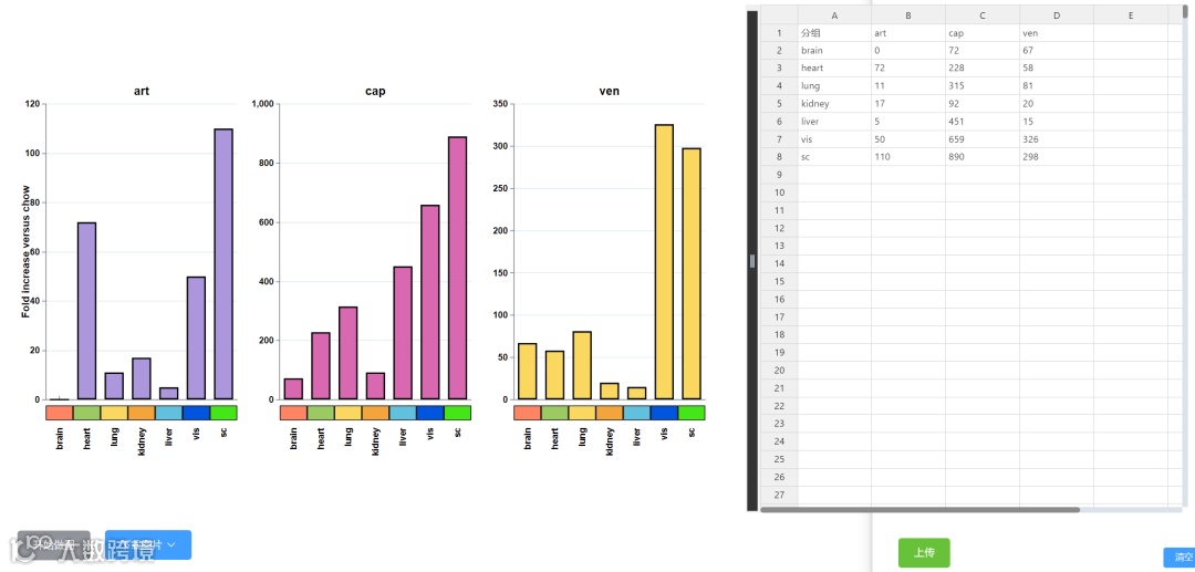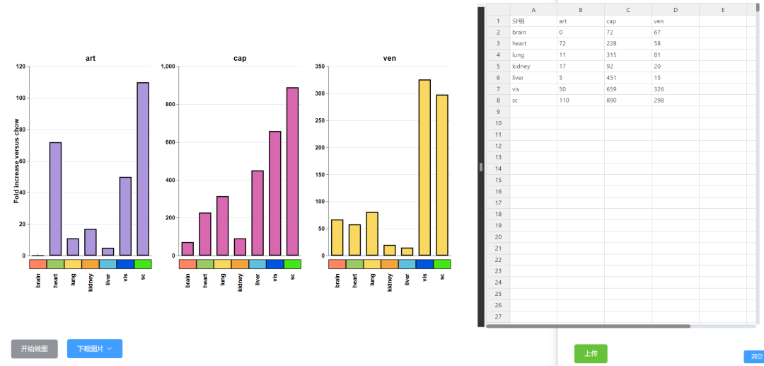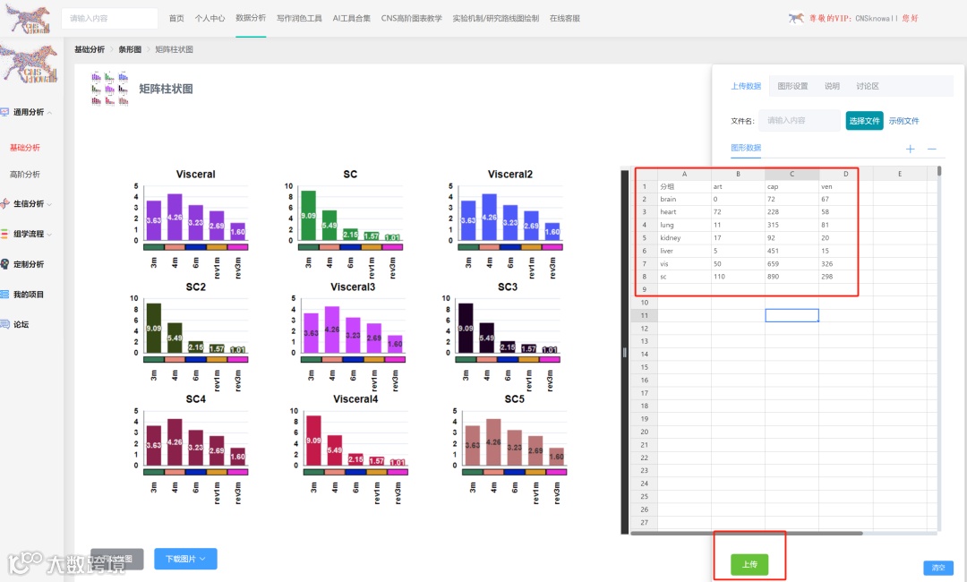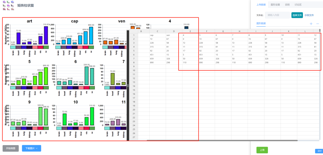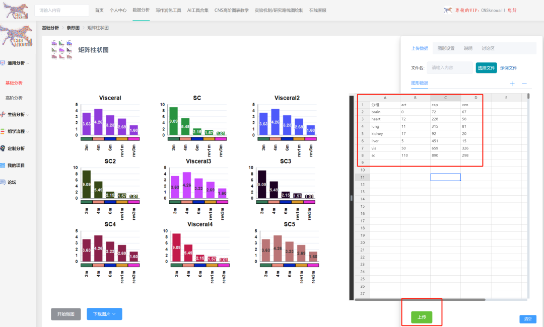 ②清空矩阵柱状图分析界面右侧表格,直接将步骤1-⑥中最后得到的可以直接用于1秒出图的数据粘贴到其中,点击上传,页面上分提示上传成功后,点击左下角的开始作图: