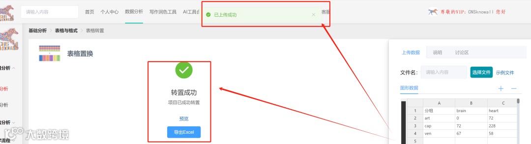 ⑥页面上传会提示上传成功,点开:导出excel,完成行列互换。