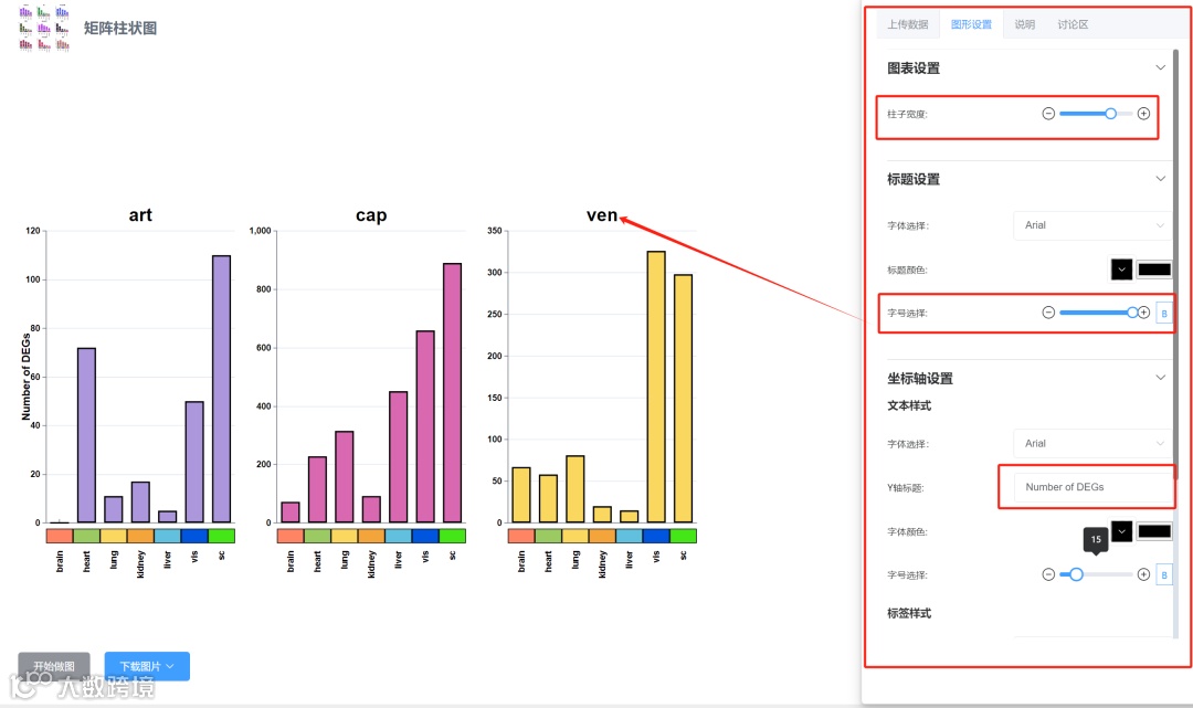 平台提供了很多个性化调参的选项,可以根据自己的喜好和目标杂志要求调整图表的字体、配色等参数。另外如果您调整的参数在课题组汇报展示的时候导师不满意,可以进去“数据分析-我的项目”找到该矩阵柱状图的分析记录,进而二次参数调整,直到导师满意为止,不用重新上传数据哦!