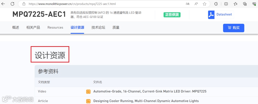 注:MPQ7225 Pspice 模型将于本月同步至MPS官网,届时用户可至MPS中文官网www.monolithicpower.cn搜索MPQ7225,在MPQ7725产品页面内的“设计资源”中(如图11-1所示),下载MPQ7225 Pspice压缩文件。