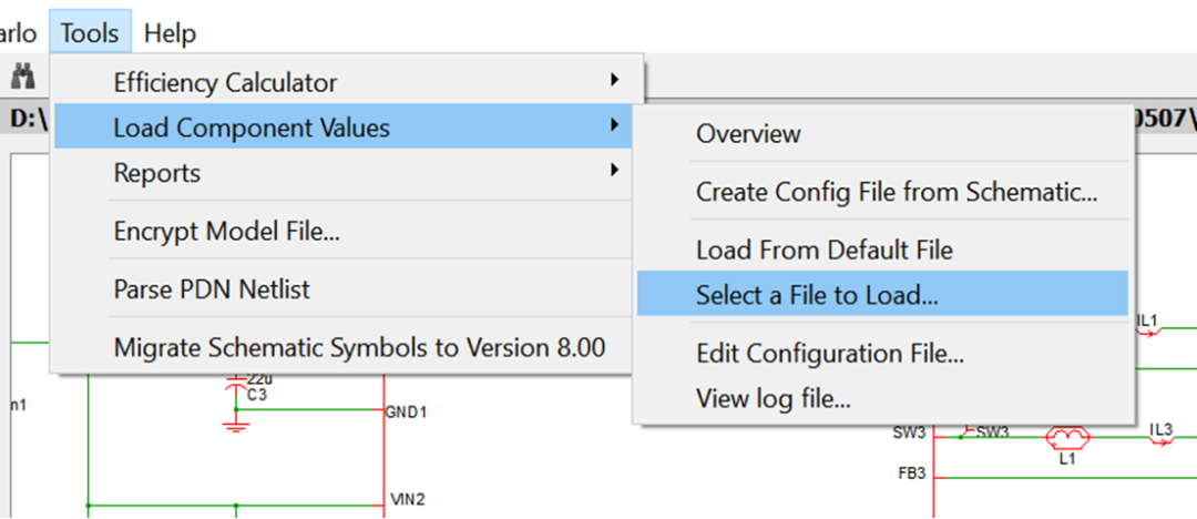 导入参数到MPSmart模型:打开相关的MPSmart仿真原理图,选择Tools-->Load Component Values-->Select a File to Load并选择document文件夹下的MPQ7225_IIC_Set_MPSmart来导入设置的参数(如图8所示)。