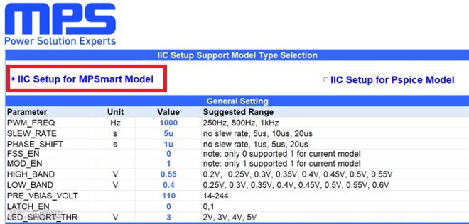 打开文件,MPQ7225 IIC Set 文件支持MPSmart和Pspice两种仿真类型。