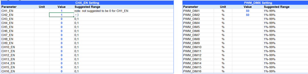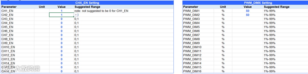 根据芯片功能,部分寄存器参数的数值会受其它部分参数影响,例如当某些channel的使能参数为低时,对应该路的PWM Dimming Duty参数为空(如图5所示),不再需要用户输入,可以节省用户设置参数的时间。