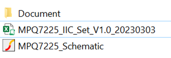 IIC Set的使用在Pspice类型或者是MPSmart类型都是相同的,当点击save to .txt后,一份名为MPQ7225_IIC_Set_Pspice.inc将生成并保存在Document文件夹下。