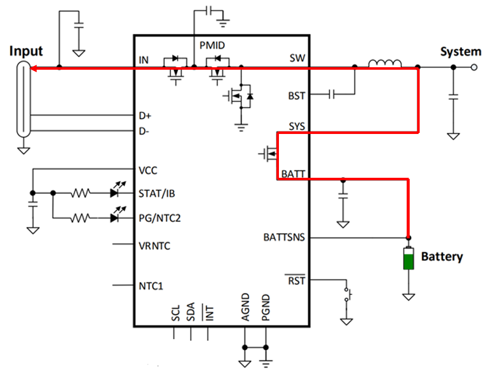 以一颗降压式Buck Charger为例,当我们把充电器接入智能设备时,充电IC就开始工作了,内部降压式转换器将一部分电能通过如红色箭头所示的路径,给系统供电,另一部分电能如绿色箭头所示的路径,给电池充电。