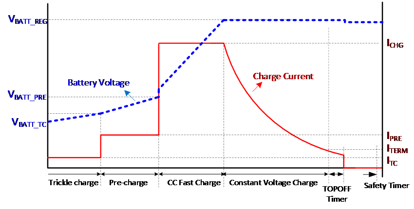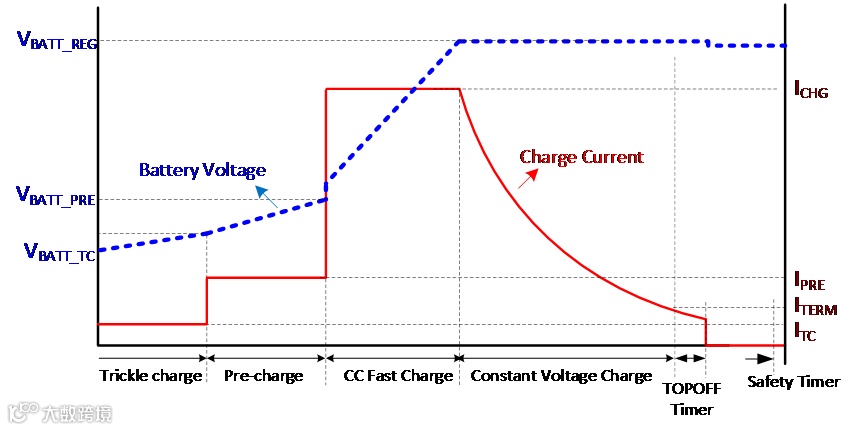 如果我们的电源输入功率足够,既能给系统供电,又能给电池充电时,此时充电过程分为四段: