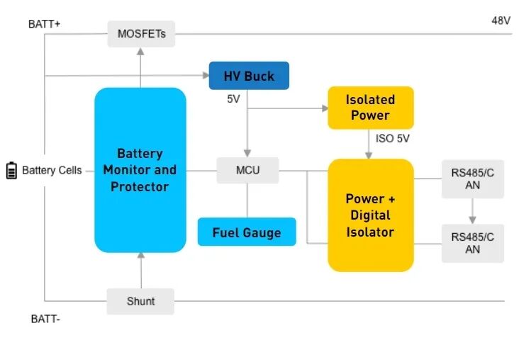 储能BMS解决方案可采用 MP2797 和 MPF4279x 系列产品组成的一站式解决方案,可实现对电池的高精度监测,保障电池安全,同时也省去了复杂的 SOC 算法开发过程。