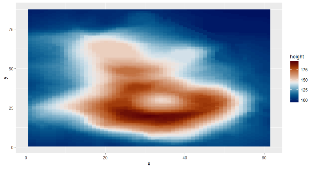 ggplot(volcano, aes(x = x, y = y, fill = height)) +