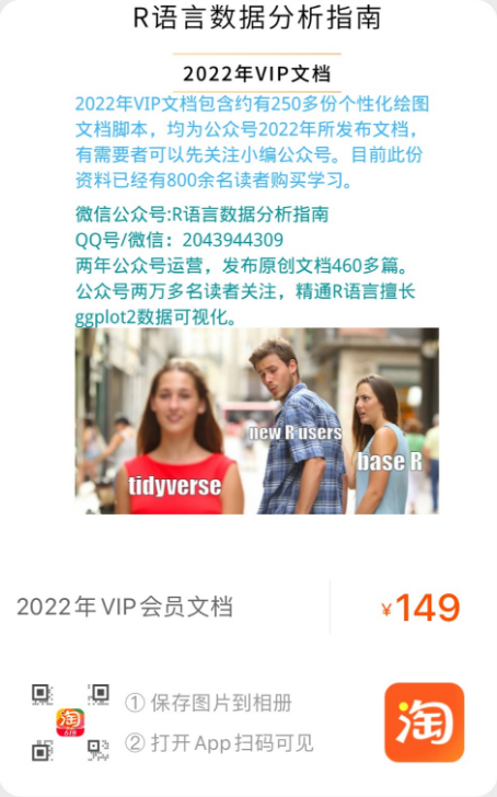 ❝「该套文档为小编2022年公众号的内容汇总」,全部内容已经更新完成,目前在小编的淘宝店铺「R语言数据分析指南」上架出售,有需要的朋友下单,购买后可添加小编微信,发送订单截图即邀请进对应的会员交流群。