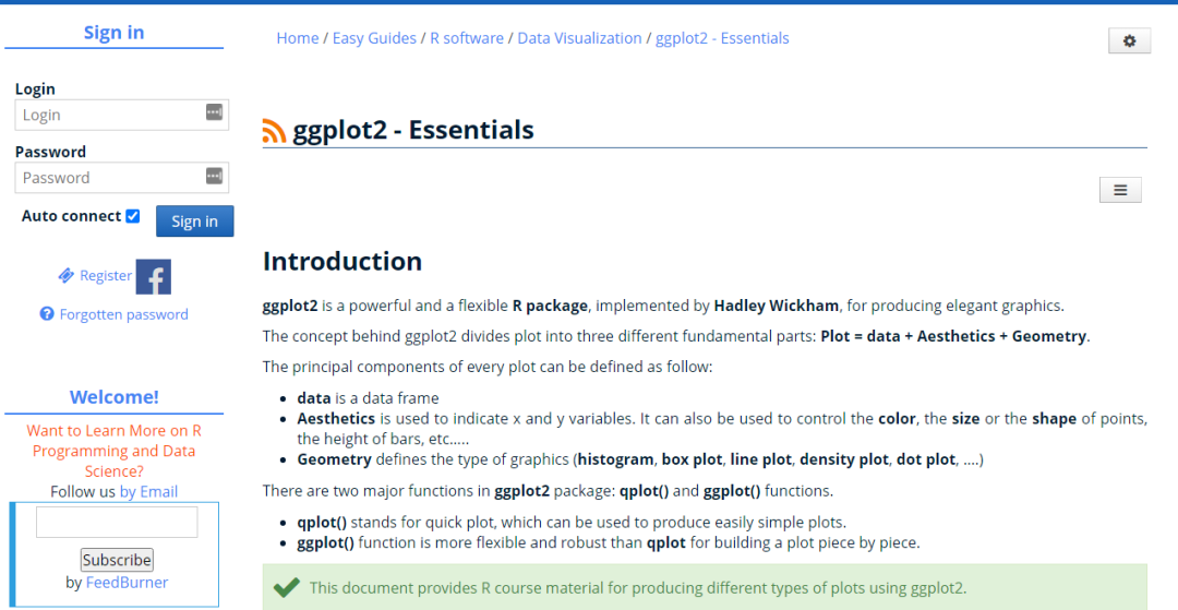 该网站由「Alboukadel Kassambara」创办,包含众多的经典文档其中的「ggplot2」模块所展示的内容非常适合初学者进行学习网址如下,此外该网站还还有众多的进阶内容这个大家可以自行了解,「在线的资源网站有很多,但是入门阶段尽量不要收集过多的资源避免看花眼」