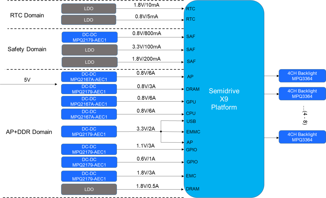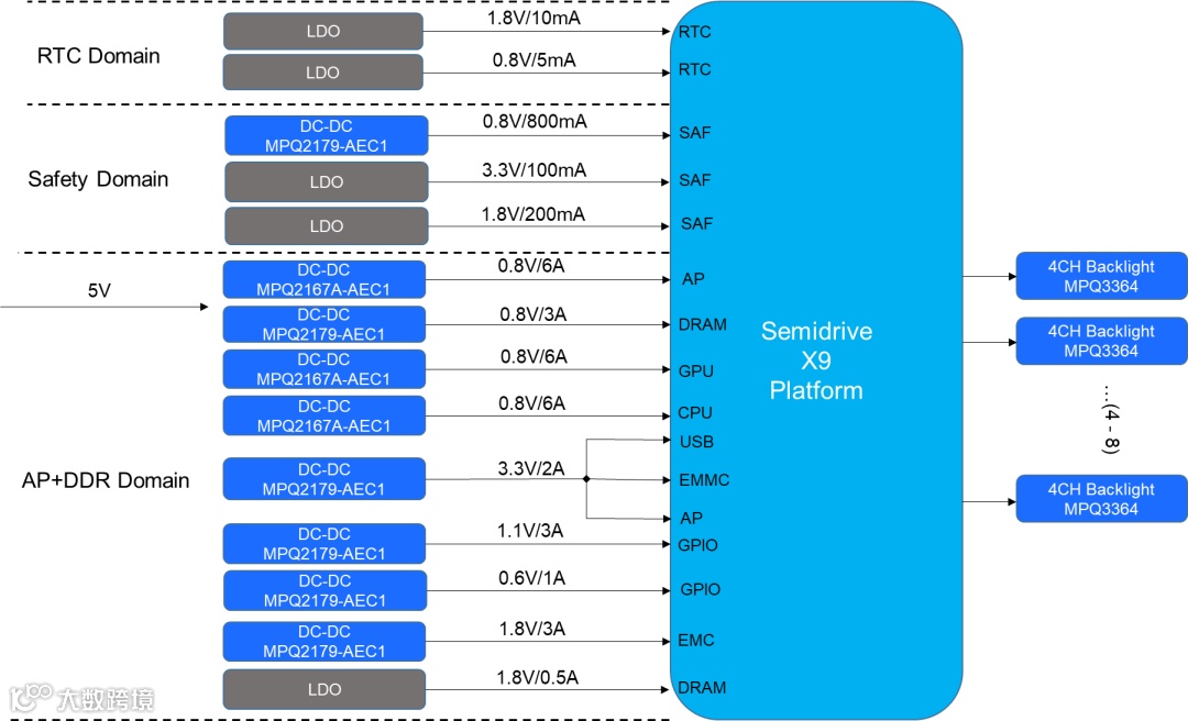 以 X9H 为例,二级电路根据 SoC 不同供电轨的电流需求,分别由输出电流 3A 的 MPQ2179-AEC1 和输出电流 6A 的 MPQ2167A-AEC1 灵活组合来实现。
