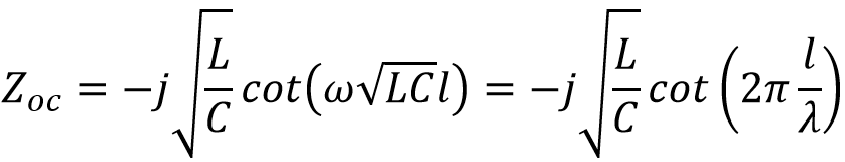 最后,由于我们的输出线的末端与参考地之间没有连接,可以认为是近似开路(末端电流为0),我们可以将(2)-(5)代入到(1),得到最终输出线上的电流与电压表达式。因此,可以得到,对于长度为l的输出线,它的阻抗ZOC可以用(6)表示: