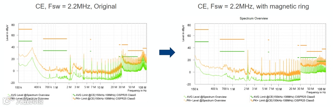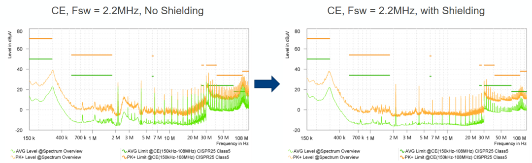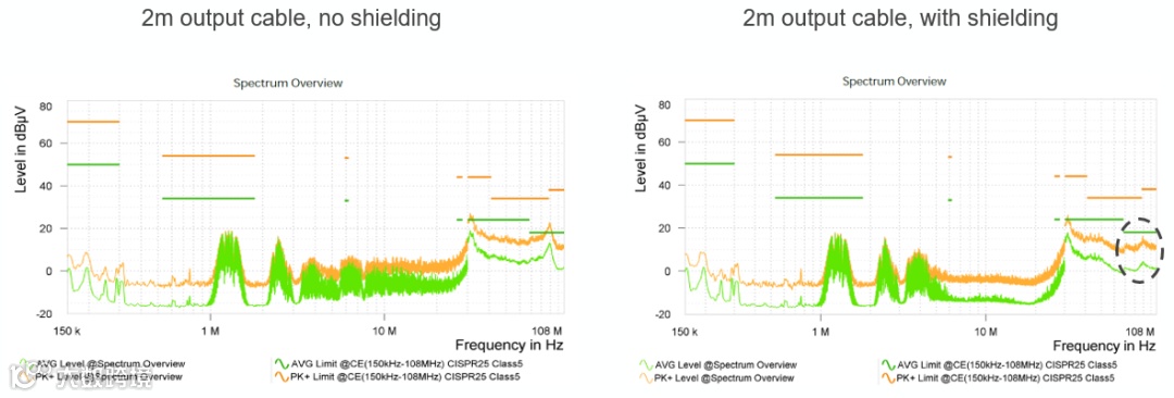 从EMI测试结果也可以验证,在加上屏蔽罩之后,如图18所示,传导噪声有明显的改善,在有2m输出线的情况下也可以满足CISPR25-Class5的要求,并有6dB的裕量。