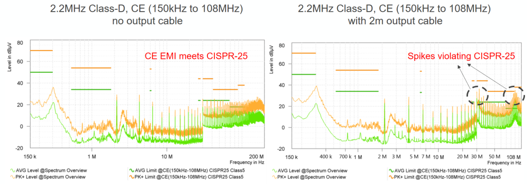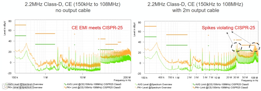 图3对比了MPS的同一个车载Class-D功放(2.2MHz,BTL,24.5W,模拟输入Class-D功放)在加输出线和不加输出线的传导EMI测试结果。从图中可以看出,在没有输出线的情况下,它的EMI可以满足CISPR25的要求,但是,在有2m输出线的情况下,EMI明显变差,尤其是在30MHz和90MHz左右出现两个峰,导致EMI难以达标。