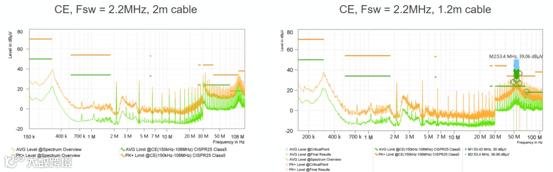图 15:输出线长为2m和1.2m时的传导EMI测试结果