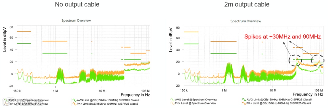 图 3:汽车电子长线与无输出线负载传导EMI对比