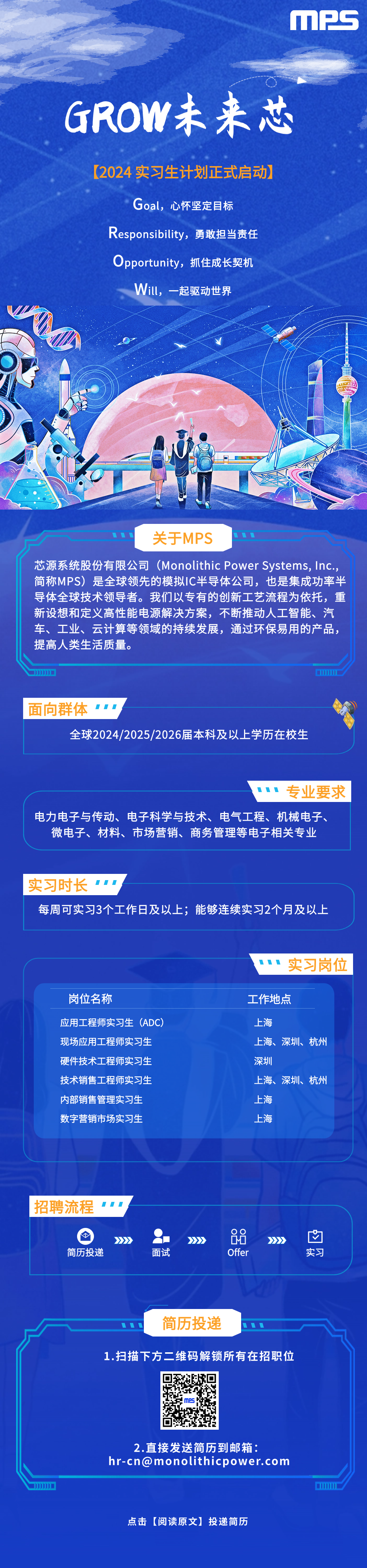 MPS是一家全球领先的半导体公司,专注于基于芯片的高性能电源解决方案。我们拥有三大核心优势:深厚的系统级知识、强大的半导体设计专业知识、独特的半导体工艺和系统集成技术及创新能力,能为客户提供可靠紧凑的单片的解决方案,使其产品更节能、更经济。