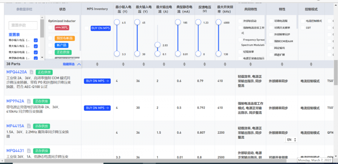 一颗40V/2A的 DC/DC 物料, 在 MPS 的官网你将搜索到将近10种型号。几轮筛选后,满足同步,轻载高效,频率可调,有车规认证,供货正常等等条件的结果也有至少3种,选择性综合症就是这样被恶化;