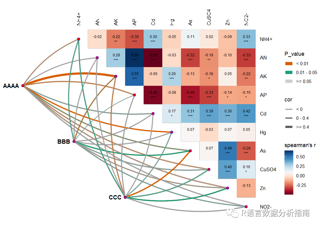 ❝最近在绘制相关性网络热图的时候突然有一个小的发现,可以使用相关性热图的数据来结合「linkET」来绘图,以前一直认为为必须使用「mantel_test」才行;果然绘图还得多思考;本节就来通过一个案例将两份数据结合起来进行绘图;「数据+代码已经上传VIP群,加群的观众老爷请自行下载」