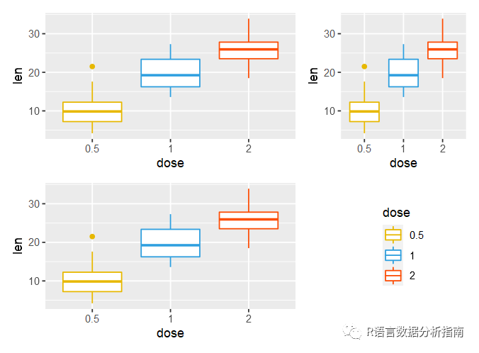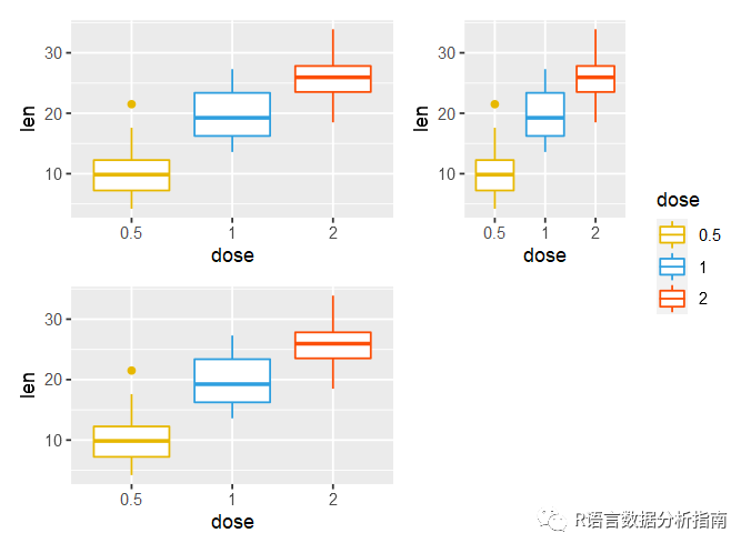 bxp <- p + geom_boxplot(aes(color = dose)) +