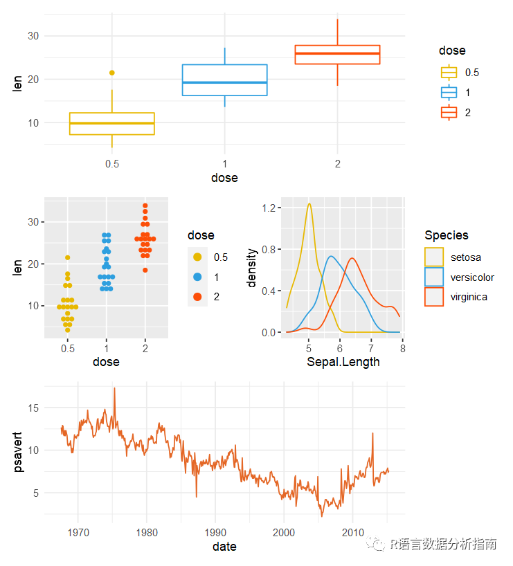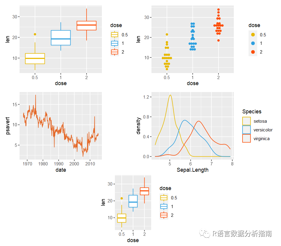 (patchwork <- bxp+dp+lp+dens+plot_layout(nrow=3,ncol=2)+