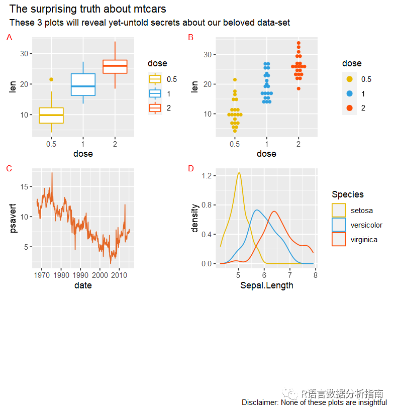 caption = 'Disclaimer: None of these plots are insightful')& theme_gray()&