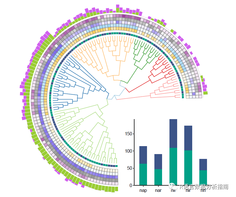 ❝「本周VIP群内」有朋友问一张系统发育树的绘制方法,原图如下所示;此图的绘制倒也不难主要用到Y叔开发的两个包「ggtree」,「ggtreeExtra」,难点主要还是在于通过微生物的数据分析得到绘图的数据;小编手边也没有合适的数据,自己构建了一份数据用于数据可视化,仅供参考;「数据及代码已经上传VIP群,加群的观众老爷请自行下载」