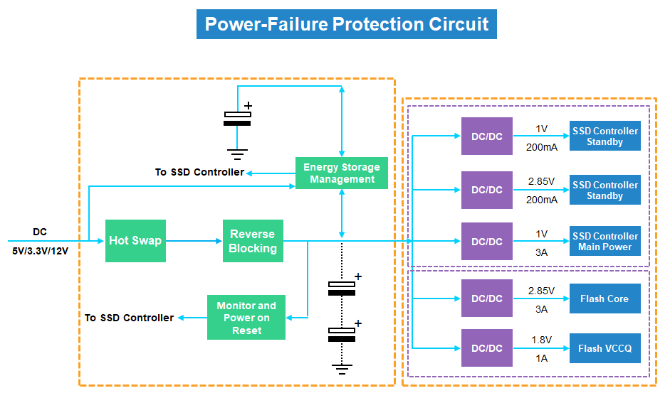 为了最小化数据丢失,MP5515设计了包含高能量密度电容的掉电检测电路。如下图所示,E-Fuse模块会持续监控SSD的供电电压,一旦供电降低到设定的阈值,则预示意外掉电事件的发生。E-Fuse就会切断供电电路,同时电容所在电路形成通路并开始放电。充足的电力保护窗口,给予数据从缓存刷写到NAND充足的时间。当电源接通时,电容会快速充电。