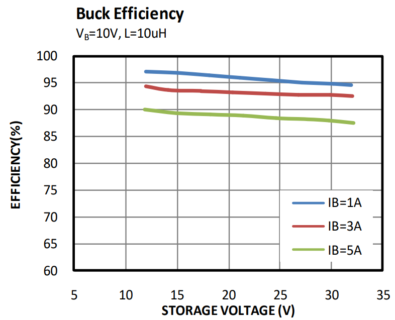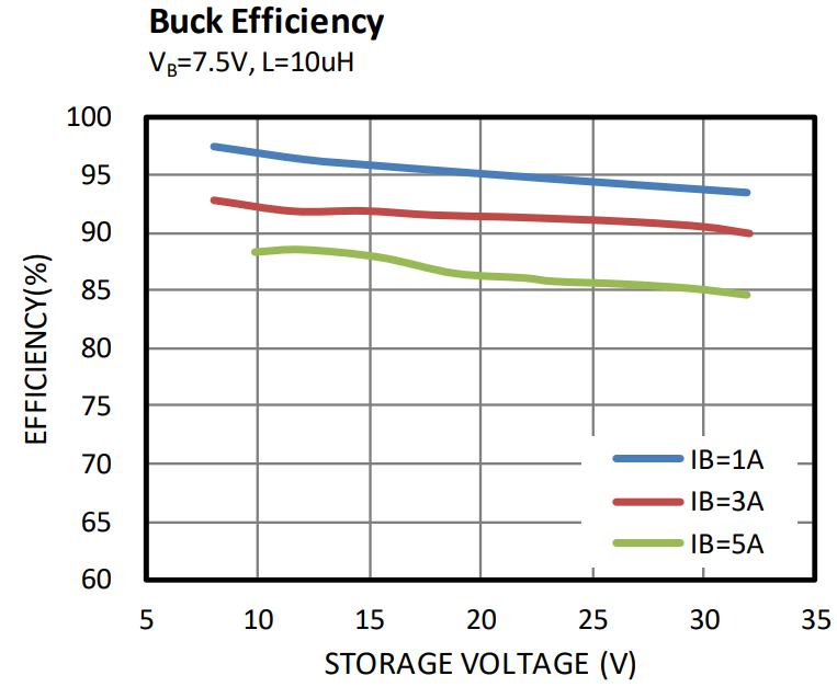 异常“掉电“时,拥有专利的MP5515集成的双向buck-boost变换器只有3个场效应晶体管,可以进一步减小变换器的功率损耗和总的解决方案尺寸。下面分别两种输出电压条件下的MP5515 备电模式下的效率曲线。