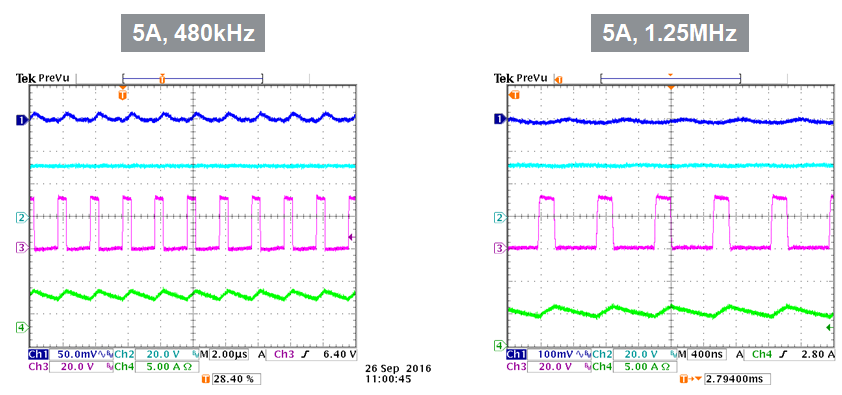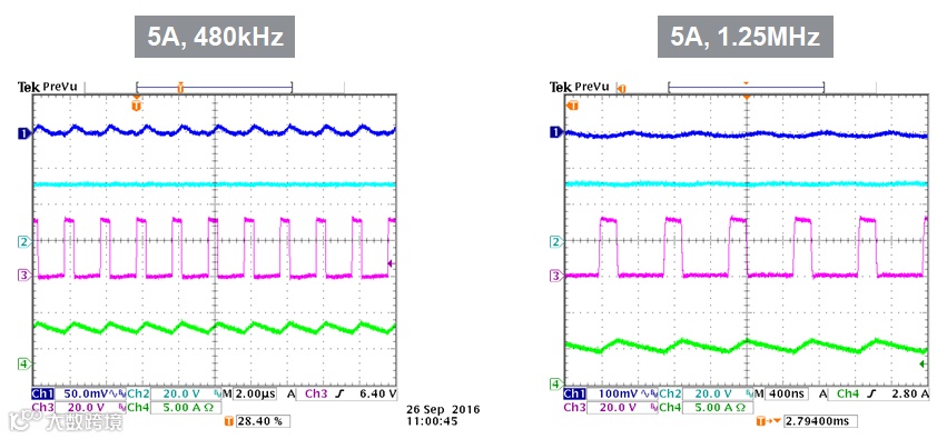 除此之外,MP5515还有很多频率选项(270kHz ~ 1.25MHz) 提供了多种电感选择的空间。