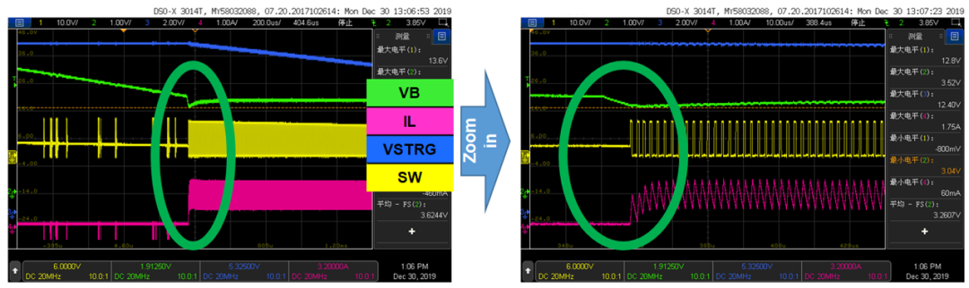 下图显示了详细的系统掉电过程。降压模式具有最大电流限制功能,以限制释放电流。在每个降压模式开关周期中,高压侧开关直到电感电流降到谷值电流限时才会打开。在降压释放模式下,MP5515采用恒定导通时间控制(COT),以实现稳定的运行和快速的动态响应。它将升压充电模式转换为降压释放模式时的电压压降和过渡时间降至最低。