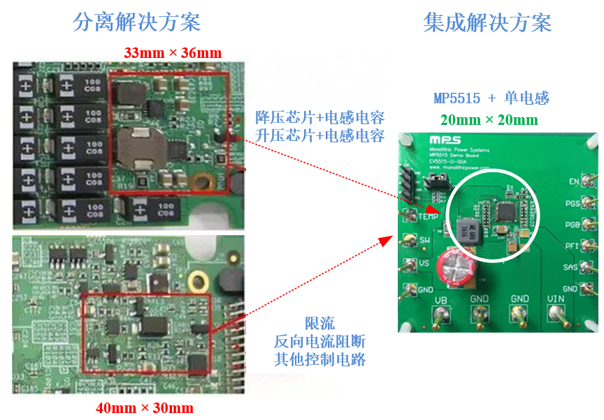 系统正常供电时,对于分离电路输入到输出需要经过Diode + BOOST + BUCK,超过5个或更多的场效应晶体管和二极管会导致功耗增加,效率较低。而对于MP5515,其输入到输出只用经过集成14mΩ MOSFET输入电流限制器。