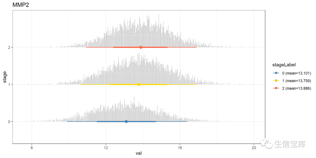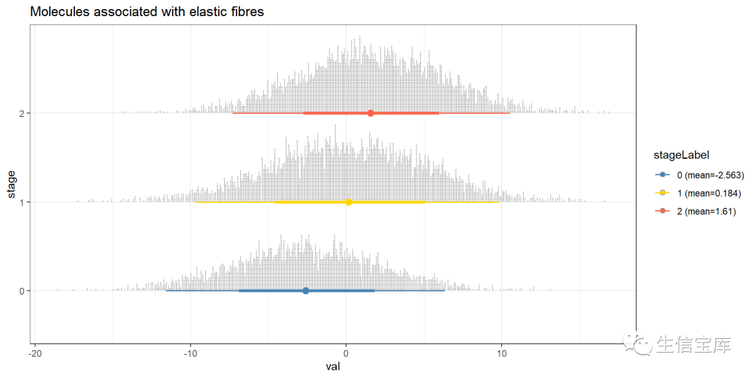 ggplot(effect, aes(x=val, y=stage, color=stageLabel, fill=stageLabel)) +
